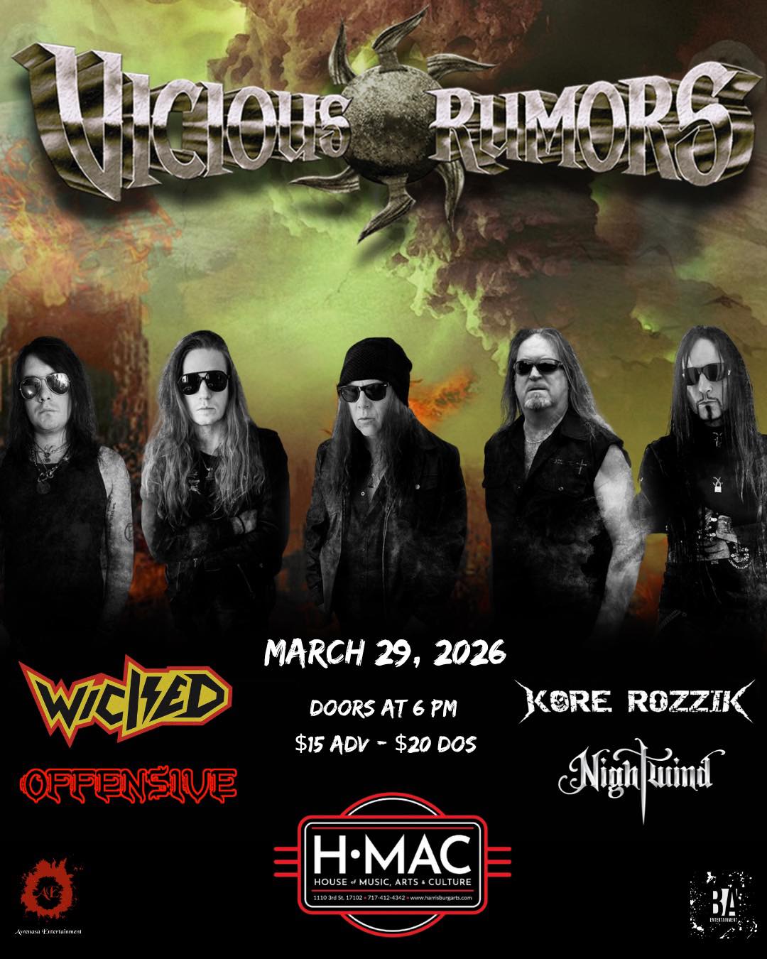 Kore returns to HMAC for a jam packed bill with Wicked and Vicious Rumors! Tickets will be reserved at the door *